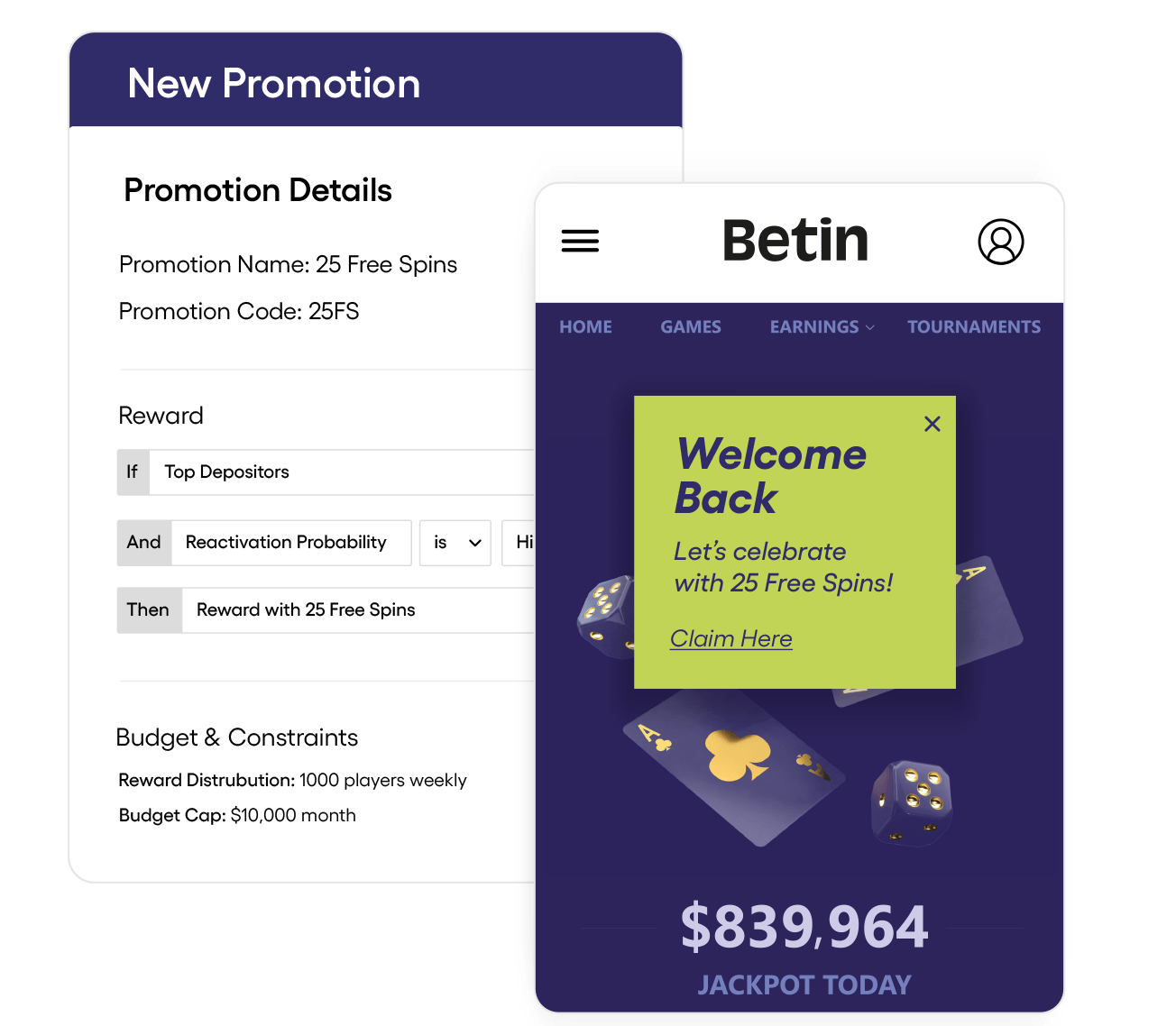 Lance de forma independiente recompensas en efectivo, giros gratis, apuestas o entradas a torneos para ejecutar su estrategia promocional en minutos.