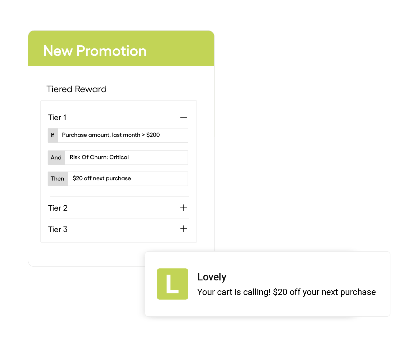 Dynamically calculate personalized rewards based on customers’ lifecycle stage, tier, transaction value, favorite product, likelihood to convert, and more.
