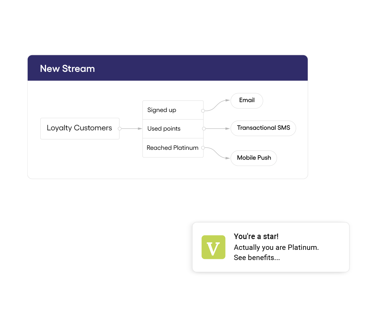 Celebrate lifecycle achievements with personalized, real-time in-app rewards that leverage the richness of unified customer profiles without the need for engineers.