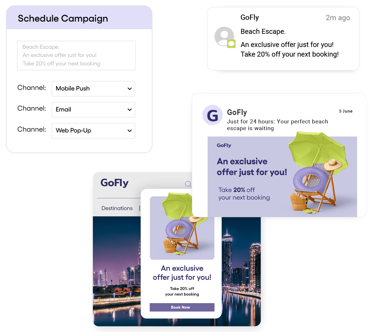 Optimove’s platform unifies native or third-party email, SMS, push, and web channels, to ensure consistent communications. Campaigns adapt to the best channel for each traveler, powered by shared data and AI decisioning.