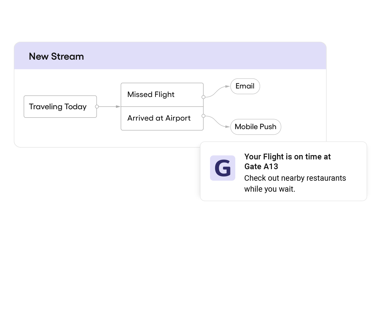 Turn real-time events into perfectly timed messages that keep travelers moving forward with confidence.